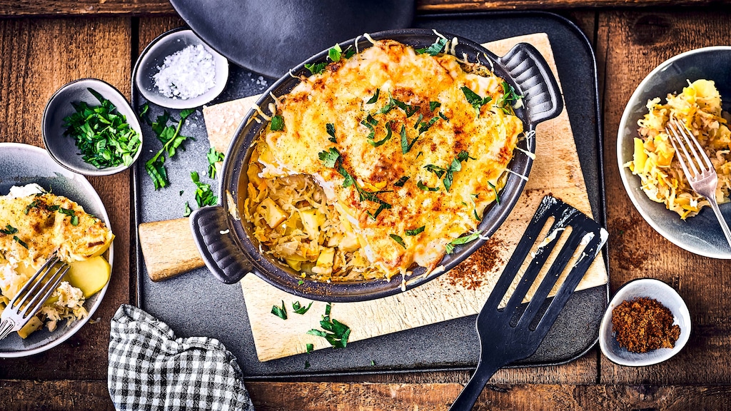 Probieren Sie unseren Sauerkraut-Gemüse-Auflauf mit Frischkäse. Mediterrane Kräuter wie Majoran und Thymian sorgen für die gewünschte Würze!