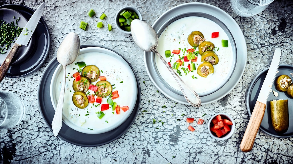 Ob mit Hackbällchen, Croûtons oder Eierstich – gekrönt mit saftigen oder knusprigen Einlagen entfalten Suppen ihr volles Aroma und erhalten obendrein Biss! Leben Sie beim Kochen Ihre Kreativität aus! Als Einlage oder „Topping“ dient alles, was Ihnen und Ihren Liebsten schmeckt. Greifen Sie auf Reis, Backerbsen oder Nudeln zurück oder entscheiden Sie sich für leckere Wurzelgemüse-Chips, geröstete Nüsse oder Räuchertofu. Gefüllte Gurkenscheiben sind in unserem Joghurtsuppe-Rezept die köstliche Einlage und Blickfang zugleich. Bereiten Sie hierfür eine Hackfleisch-Feta-Mischung zu, die Sie per Spritzbeutel in eine zuvor ausgehöhlte Salatgurke füllen. Eingewickelt in Alufolie gart die Gurke ungefähr 40 Minuten lang im Ofen. Im Anschluss schneiden Sie sie in Scheiben und verteilen diese zusammen mit Paprikawürfeln auf der Joghurtsuppe. Planen Sie ca. 70 Minuten Zubereitungszeit für dieses ausgefallene Gericht ein, das Ihre Gäste begeistert und nicht nur im Sommer ein erfrischender Genuss ist! Und wenn es einmal schneller gehen soll, bereiten Sie eine kalte Gurkesuppe mit Joghurt, Knoblauch und Walnüssen nach unserem Tarator-Rezept zu – schnell gemacht und super lecker.
