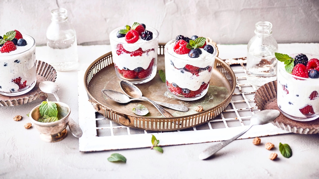 Die Beeren mit dem Joghurt abwechselnd in Gläser schichten und servieren