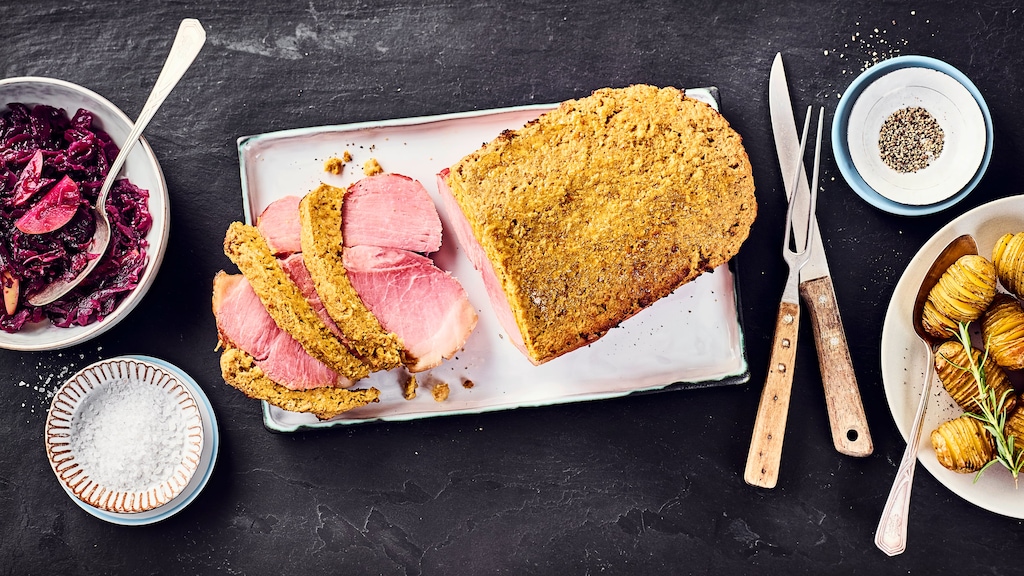 Auch als Julschinken oder schwedischer Weihnachtsschinken bekannt: Wir bereiten unser Schinkenbraten-Rezept zum Fest mit leckerer Senfkruste, Apfel-Rotkohl und gefächerten Hasselback-Kartoffeln zu. God Jul!