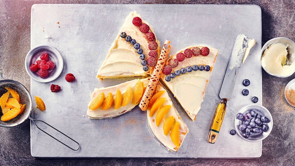 In der Zwischenzeit den Schmetterlingskuchen mit Obst nach Belieben dekorieren. Besonders gut eignen sich hierfür Beerenfrüchte wie Himbeeren und Heidelbeeren, Orange, Banane, Mandarine und Weintrauben.