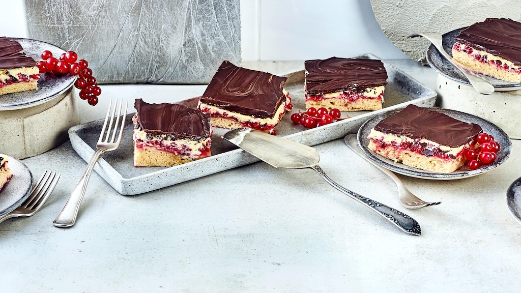 Der Schneewittchenkuchen und die Donauwelle haben viel gemeinsam. Bei beiden Backkreationen bettet sich Obst auf einen Rührteig, gefolgt von einer Buttercreme mit Pudding und einer Schicht Kuvertüre. Während für das Donauwelle-Rezept in aller Regel Sauerkirschen zum Einsatz kommen, schmücken den Schneewittchenkuchen nach unserem Rezept rote Johannisbeeren – Sie können aber natürlich genauso gut Kirschen verwenden. Mit Johannisbeergelee verfeinern Sie übrigens unsere Linzer Törtchen. Möchten Sie das typische Wellenmuster im Teig erzeugen, fügen Sie einer Hälfte des Rührteigs einfach Kakao hinzu. Durch das Eindrücken der Kirschen bilden sich dann die Wellen. Auch die Form und die oberste Schicht dürfen variieren. Backen Sie Ihren Schneewittchenkuchen statt auf dem Blech wie eine Torte in einer runden Springform oder wählen Sie als Finish nicht Schokolade, sondern Butterkekse für ein knuspriges Geschmackserlebnis. Soll der Kuchen festlicher wirken, kann auch ein roter Tortenguss den Abschluss bilden. Noch mehr fürs Auge bietet übrigens unsere Feigentorte, die mit Fondant, Mürbe- und Brandteig sowie einer feinen Creme optisch wie kulinarisch begeistert. Ein weiteres Backwerk für Liebhaber säuerlicher Früchte ist unser Johannisbeerkranz aus Hefeteig.