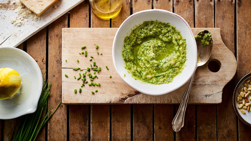 Ein Glas Pesto hat schon so manche Mahlzeit gerettet, wenn es schnell gehen musste oder der Supermarkt zu war. Unser Schnittlauchpesto-Rezept ist in nur 15 Minuten fertig. Und wenn Sie mehr davon zubereiten, sind Sie immer auf der sicheren Seite – und zaubern im Handumdrehen ein leckeres Gericht.