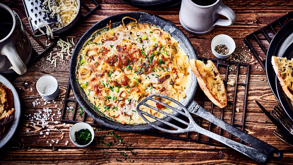 Lust auf ein deftiges Fleischgericht? Probieren Sie unser Rezept für Schweineschnitzel in Zwiebel-Sahne-Soße aus: Mit Kräuter Creme fraiche, Knoblauch, geriebenem Käse und einem Schuss Weißwein!