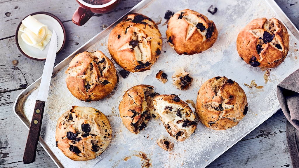 Die Brötchen mit einem scharfen Messer kreuzförmig einritzen und auf mittlerer Schiene für 25 Minuten goldbraun backen.