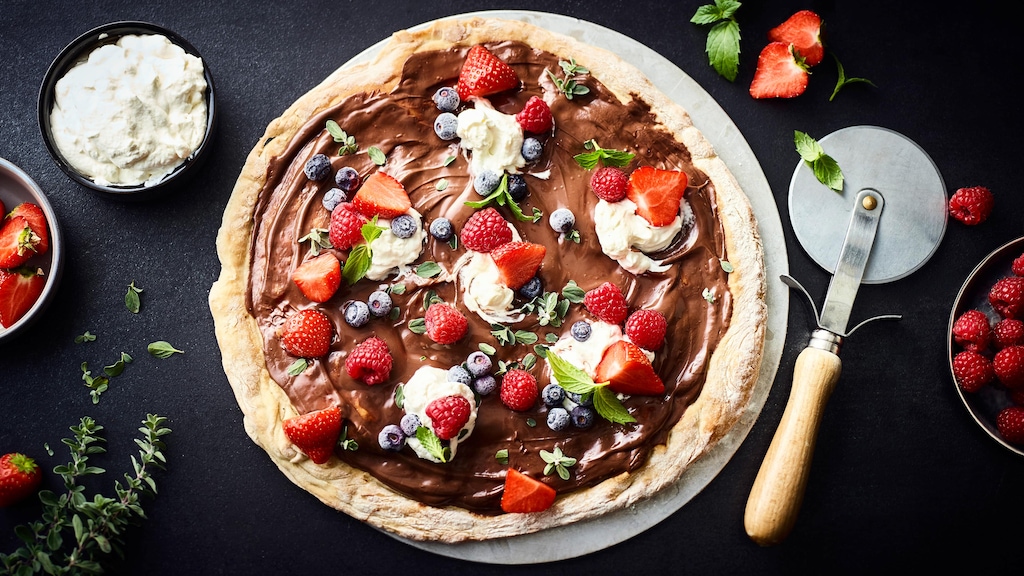 Pizza mal anders: frischer Hefeteig, bestrichen mit einer Schicht Nuss-Nougat-Creme und belegt mit frischen Beeren. Unsere Schokoladenpizza ist das Highlight auf jeder Party. Schmeckt aber auch einfach so zum Nachtisch!