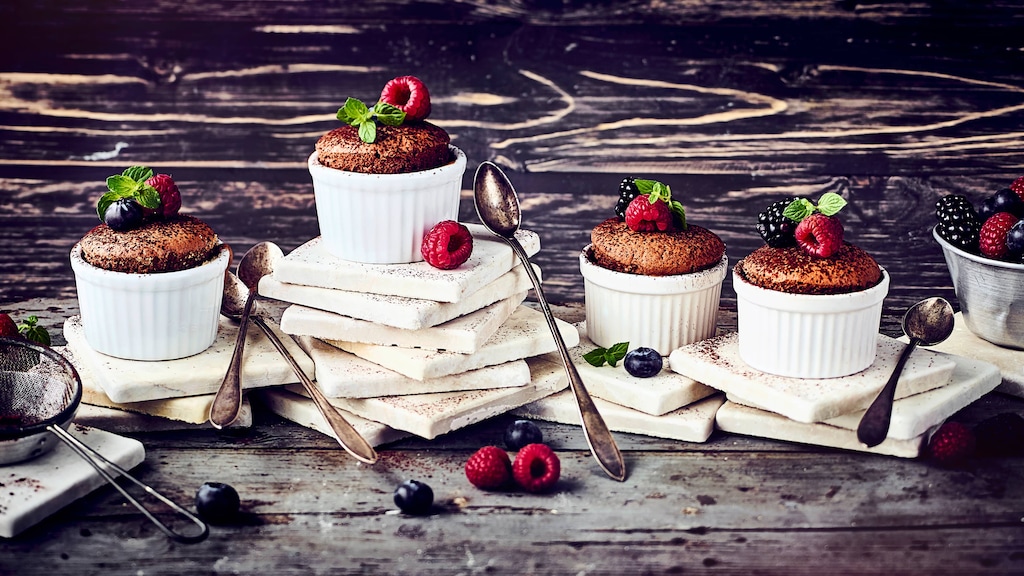 Unser Schokosoufflé-Rezept ist ein Traum von Dessert: Wenn die noch warmen kleinen Kuchen auf frische Himbeeren, Brombeeren oder Blaubeeren treffen, läuft uns schon bei dem Gedanken daran das Wasser im Mund zusammen. Und das Schokosoufflé-Rezept gelingt einfacher, als Sie vielleicht denken: Wenn Sie sich genau an die Backzeit halten und die Soufflés aus dem Ofen nehmen, wenn sie gerade über den Rand der Form hinausgewachsen sind, kann eigentlich nichts schiefgehen. Und selbst wenn Sie die Schokomuffins mal etwas länger im Ofen lassen, werden sie zwar fester – dem Geschmack tut das aber keinen Abbruch! Das gilt übrigens genauso für herzhafte Ofenträume wie unser Käsesoufflé oder für dieses leckere Soufflé vom Grill mit Erdbeer-Aprikosen-Salat und Minzpesto.