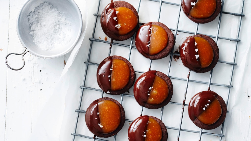 Plätzchen haben immer Saison: Probieren Sie unser Schokotaler-Rezept mit einem Topping aus süßem oder salzigem Karamell und dunkler Schokolade – zum Selber-Genießen oder Verschenken.
