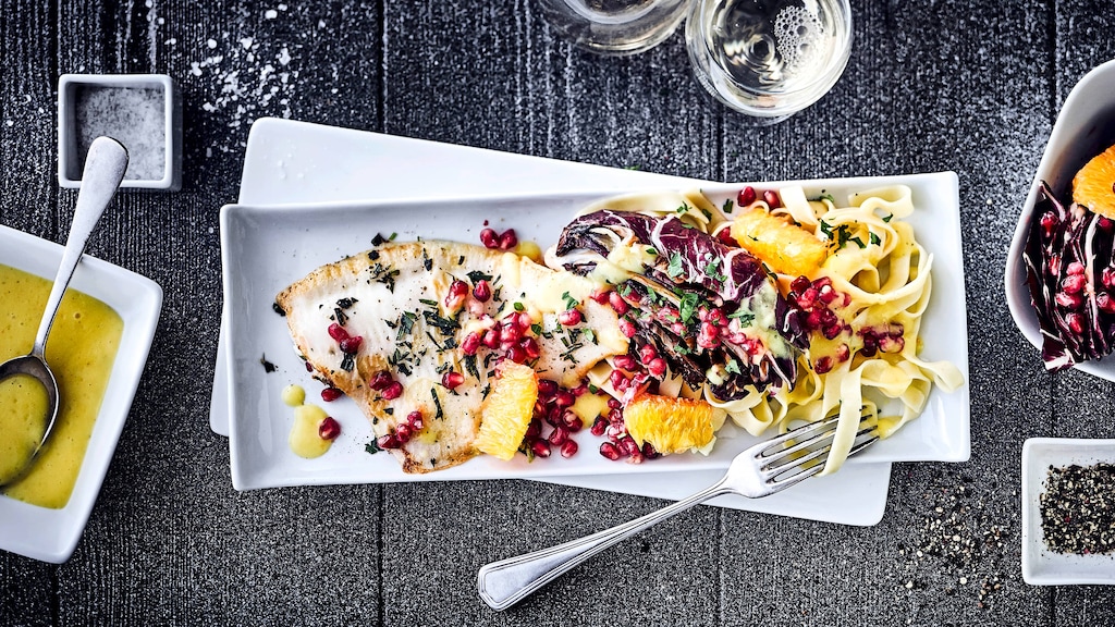 Exotischer Fisch: Unser Schollenfilet bekommt eine Mango-Soße und wird von einem frischen Radicchio-Orangen-Salat begleitet – Guten Appetit!