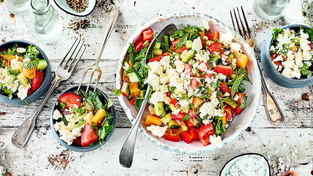 Schopska Salat kommt aus der bulgarischen Küche, ist schnell hergestellt und kann traditionell als Vorspeise oder als sommerlicher Snack gereicht werden.