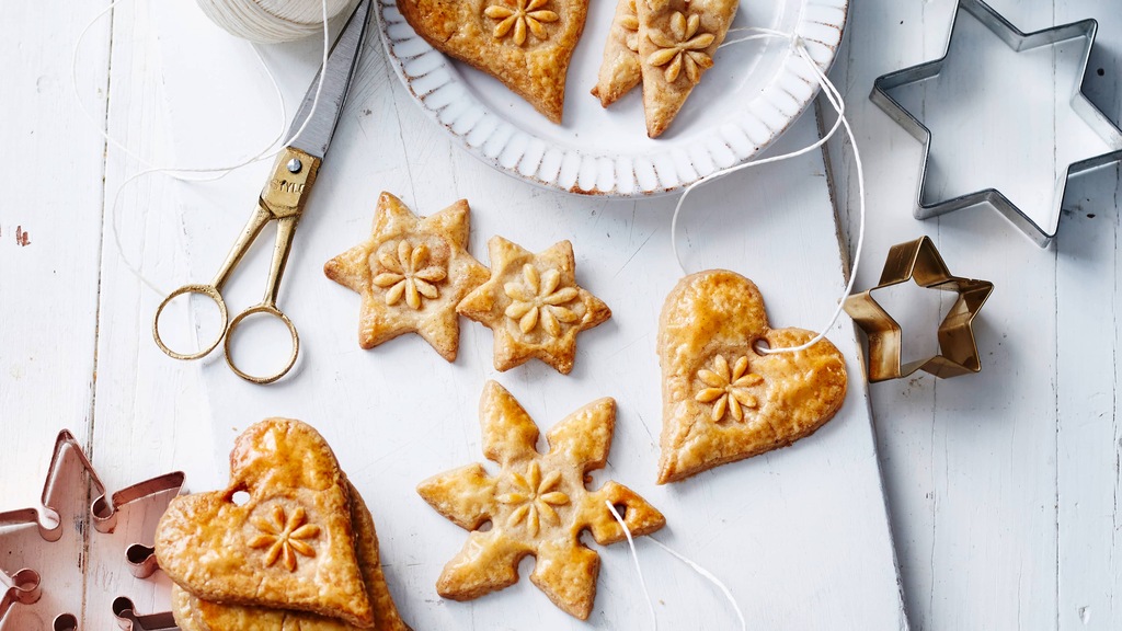 Plätzchen auf zwei mit Backpapier belegten Backblechen verteilen. Mit der Ei-Sahne-Mischung bepinseln. Ca. 10 Min. backen, abkühlen lassen. In Dosen kühl aufbewahren oder auf ein dünnes Band fädeln und aufhängen.