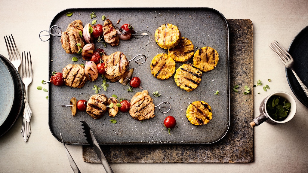 Das Fleisch abtropfen lassen und abwechselnd mit den Kirschtomaten und den Zwiebelhälften auf die Spieße stecken. Die Spieße und die Maisscheiben insgesamt 8-10 Minuten von allen Seiten grillen. Mit Majoran garnieren.
