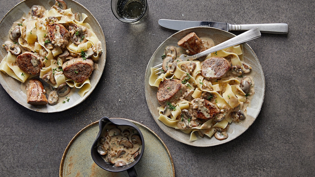 Die cremige Pilzsauce schmeckt hervorragend zu den Schweinelendchen. Dazu passen Bandnudeln und ein grüner Salat – und das Sonntagessen ist fertig!
