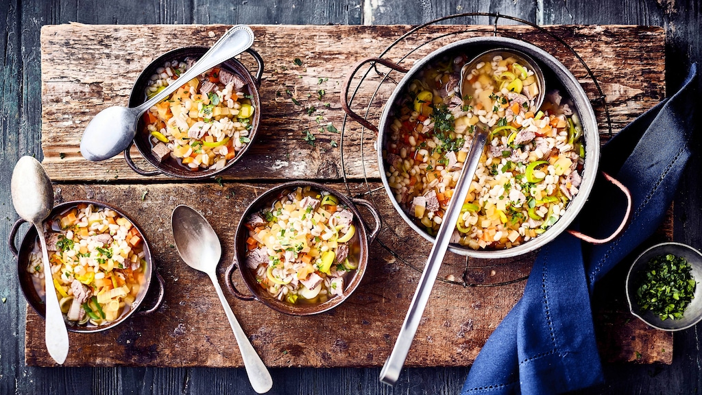 Kennen Sie die traditionelle „Scotch Broth“, eine gehaltvolle Suppe aus Schottland? Probieren Sie unser Rezept mit Lammfleisch, Graupen, Steckrüben, Möhren und Lauch einmal aus – fertig in 60 Minuten!