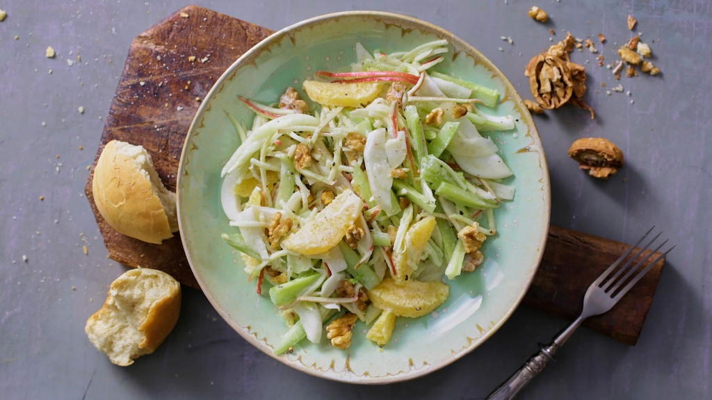 Die wahrscheinlich berühmteste Version eines Salats aus Apfel, Sellerie, Walnusskernen und Mayonnaise entstammt dem New Yorker Waldorf Hotel. Bereits im 19. Jahrhundert entstand dort die heute weltbekannte Kombination. Zentrale Zutat des ursprünglichen Waldorfsalat-Rezepts war Knollensellerie – respektive ein Mix aus Knollen- und Staudensellerie. Letzterer schmeckt ein wenig frischer als Knollensellerie und bildet die Basis unserer Weiterentwicklung der Rezeptlegende: Für unser Selleriesalat-Rezept vereinen Sie die Staude mit Äpfeln, Fenchel, Orangen und Crème fraîche. Die Kombination aus der Süße und leichten Säure der Äpfel, dem herzhaft-frischen Sellerie, knackigen Nüssen und leicht salziger Salatcreme beschert intensiven Genuss – und so zaubern Sie zusammen mit dem aromatischen und leicht scharfen Dressing für den Selleriesalat eine leckere Vorspeise auf die Teller Ihrer Gäste. Besonders gut dazu passen frisch gebackene Brioches, die Sie zusammen mit dem Salat in etwa einer Stunde zubereiten können. Baguette eignet sich natürlich ebenso gut als Begleitung. Und wenn Sie noch auf der Suche nach einem besonderen Dessert sind, backen Sie doch einmal unseren Walnusskuchen, der mit einer warmen Karamellsoße serviert wird.