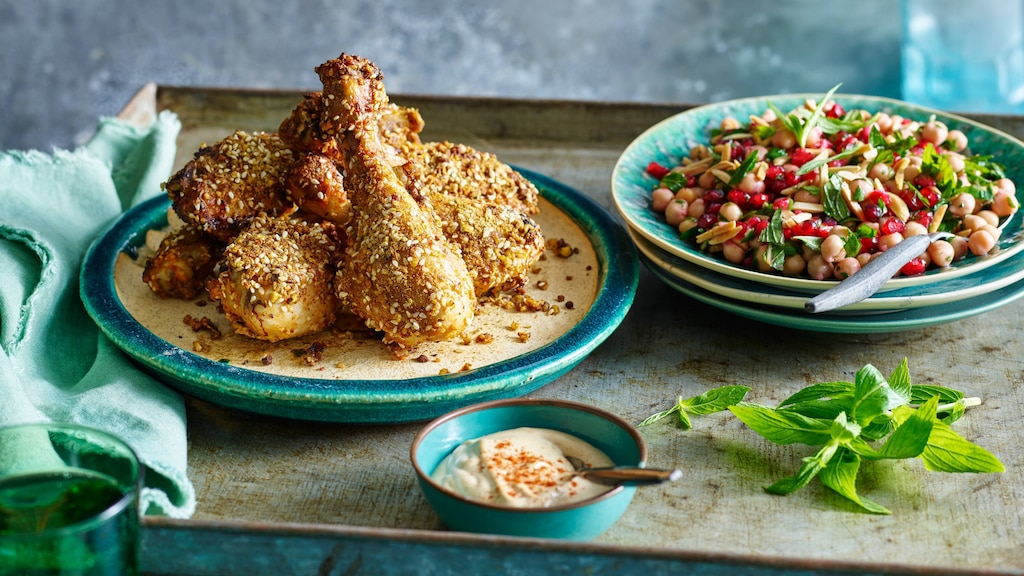 Knusprig gebackene Sesam-Hähnchenschenkel mit Kichererbsensalat und Sie haben ein leckeres orientalisches Gericht.