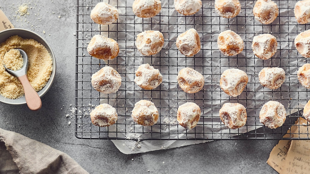 Puderzucker auf ein Brett oder eine gesäuberte Arbeitsplatte sieben. Mandelteig durch den Puderzucker zu einer länglichen Rolle rollen und etwa walnussgroße Stücke von 20 g abtrennen. Zu Kugeln formen und nochmals in Puderzucker wälzen.