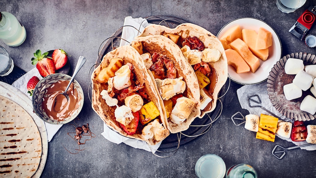 Tortillas wie eine Tasche mit jeweils 2 Scheiben krossem Bacon, einem Frucht-Marshmallow-Spieß und Schokolade befüllen. Für 2 Minuten von beiden Seiten grillen.