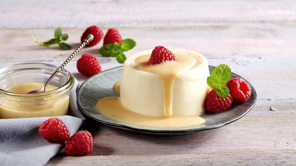 Unser Tipp für ein fruchtiges, veganes Dessert: Probieren Sie unser Soja Panna cotta mit Agar Agar, frischen Himbeeren und Karamellsoße!