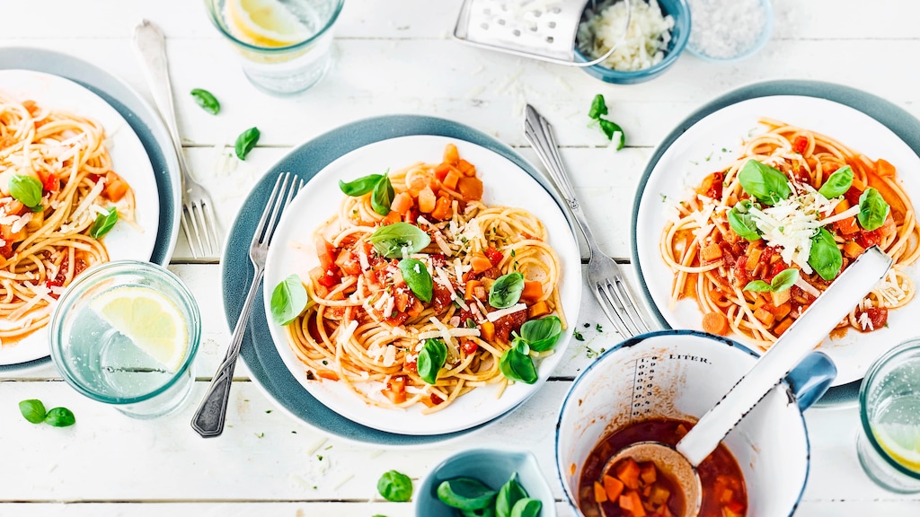 Dieses vegetarische Pastagericht schmeckt nicht nur Kindern gut: Probieren Sie unsere Spaghetti mit einer Soße aus Karotten, Zwiebeln, Pastinaken und Paprika – fertig in 35 Minuten!