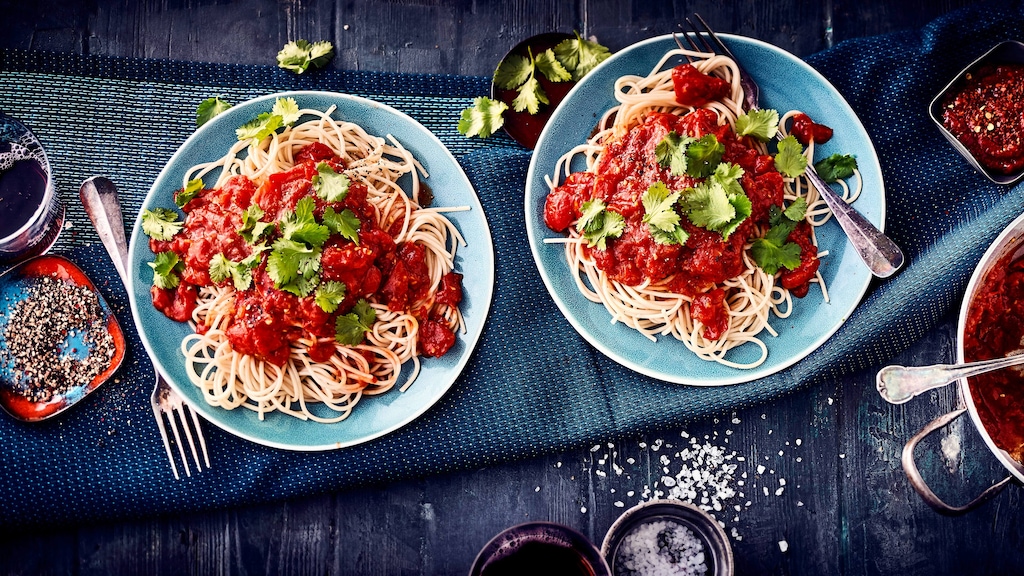 Haben Sie Appetit auf ein pikantes Pastagericht? Probieren Sie unsere Spaghetti mit scharfer Tomatensauce mit viel Tomaten, Ingwer und einem Hauch Chili.
