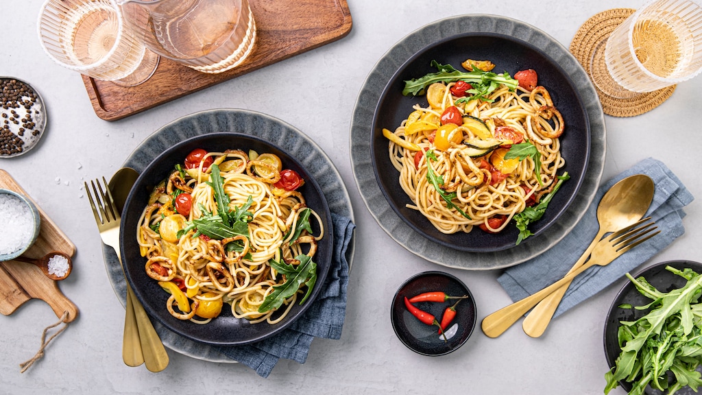 Tintenfischringe landen in unseren Breiten meist frittiert auf dem Teller. In unserem Rezept werden die Calamari zusammen mit Zucchini und Cherrytomaten zu einer leckeren Pastasoße, die nach Meer schmeckt.