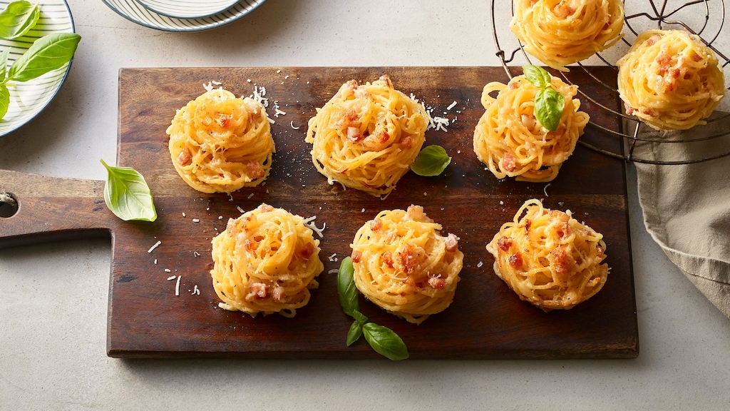Spaghetti sowie die Zwiebel-Schinken-Mischung und ¾ des Parmesans unter die Eigelb-Sahne-Masse heben. Mithilfe eines Esslöffels und einer Gabel die Spaghetti zu Nestern aufdrehen und in die gefetteten Mulden der Muffinform setzen. Übrige Soßenreste auf die Nester gießen und mit dem restlichen Parmesan bestreuen.