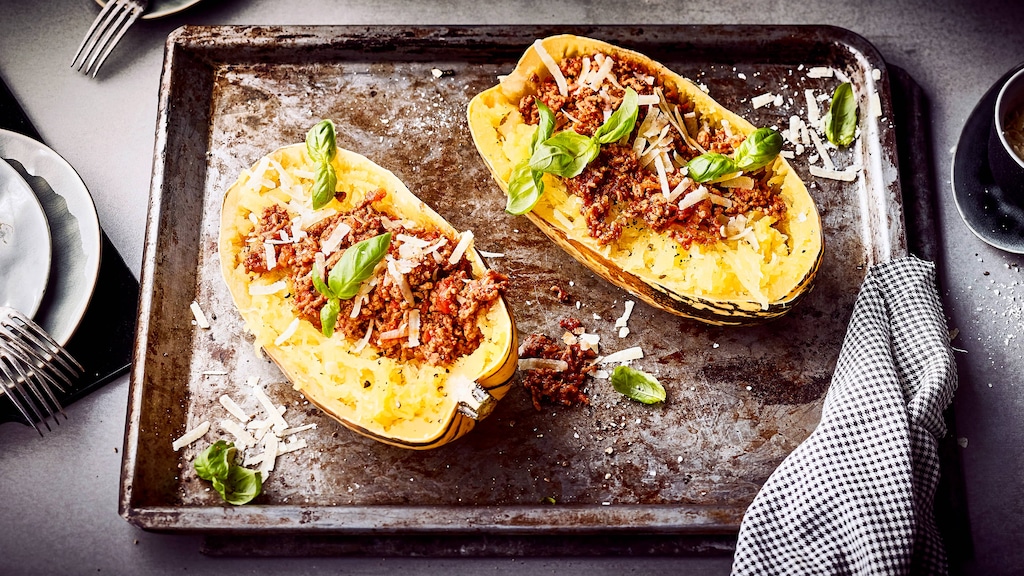 Hokkaido-Kürbisse kennt jeder – aber haben Sie sich schon mal an einem Spaghettikürbis-Rezept versucht? Diese Kürbissorte ist nicht so verbreitet wie etwa der Hokkaido- oder der Butternut-Kürbis, er wird aber wegen seiner einfachen Zubereitung durchaus geschätzt: Sie können ihn kochen, dämpfen oder backen, seinen Namen trägt er, weil Sie nach der Zubereitung sein Fruchtfleisch in spaghettiartige Fäden zerzupfen können. Mit dieser Eigenschaft eignet sich der Spaghettikürbis übrigens auch super für die Low-Carb-Küche: Statt Pasta geben Sie Ihre Lieblingssauce einfach über die Fasern des Kürbisses! Auch unser Spaghettikürbis-Rezept wird mit einer Bolognesesauce, wie sie auch zu Pasta bolognese serviert wird, ergänzt und verfeinert. Und die Mahlzeit bringt ihr Geschirr quasi schon mit (was das Rezept auch für ein dekoratives Partyessen prädestiniert): Sie füllen die Sauce in den gebackenen Kürbis und löffeln das Gericht einfach direkt aus der Kürbishälfte! Wenn Sie sich fragen, ob die Spaghettikürbis-Schale essbar ist, lautet der Rat allerdings: lieber nicht.