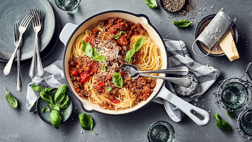 Mögen Sie es mediterran und herzhaft? Dann probieren Sie unsere Spaghettipfanne mit Kirschtomaten, Sellerie, Möhren und Rinderhack einmal aus – verfeinert mit einem Schuss Rotwein!