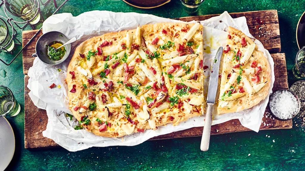 Ob in einer Spargel-Quiche, als Spargel-Tortilla, kalt als Salat oder zu Pellkartoffeln – Spargel schmeckt gekocht und gebacken! Eine tolle Idee für die Zubereitung im Ofen bietet Ihnen unser Spargel-Flammkuchen-Rezept: Während ein typischer Elsässer Flammkuchen seine feine Würze und seinen kräftigen Geschmack durch Frühlingszwiebeln und Speck erhält, kommen bei unserem Spargel-Flammkuchen bissfest gekochter, weißer Spargel und dünn geschnittener Kochschinken zur Verwendung. Mit geriebenem Parmesan und etwas Kräuteröl verfeinern Sie Ihren knusprig im Ofen gebackenen Spargel-Flammkuchen zusätzlich.