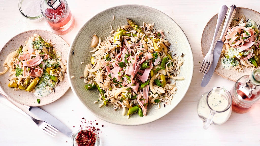 Köstliches zum Frühling- Unsere knackige Spargel-Reis-Pfanne ist mit Kräuter-Hollandaise und Serranoschinken schnell und einfach gemacht.