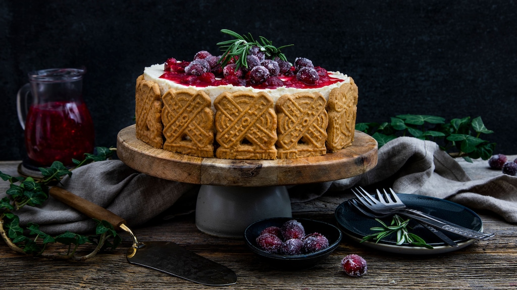 Das knusprige Mürbeteiggebäck gehört zu Weihnachten wie die Kugeln an den Christbaum – und der süß-würzige Geschmack von Spekulatius macht sich besonders gut mit säuerlichen Aromen wie dem von Kirschen oder Beeren, weshalb Sie auch unser Spekulatius-Parfait mit einem selbst gemachten Sauerkirschkompott servieren. In unserem Rezept für Spekulatius-Torte stellen wir eine Soße aus herben Cranberrys sowie fruchtigen Himbeeren und Orangensaft her, die Sie am Schluss über den Kuchen gießen. Die Grundlage bildet ein Keksboden aus zerbröseltem Spekulatius und zerlassener Butter, der nur gekühlt werden muss. Es handelt sich deshalb um eine Spekulatius-Torte ohne Backen. In die Nähe von Perfektion gelangt sie durch die aromatische Mascarpone-Creme mit Zimt, Orange und Vanille – eine köstliche Mischung für Weihnachtsdesserts.