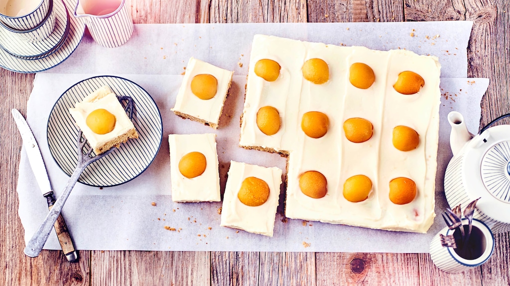 Creme gleichmäßig auf dem ausgekühlten Kuchenboden verteilen. Aprikosenhälften in gerader Linie darauf verteilen, sodass Quadrate geschnitten werden können, bei denen die Aprikosenhälften wie Eidotter bei einem Spiegelei mittig angeordnet sind.