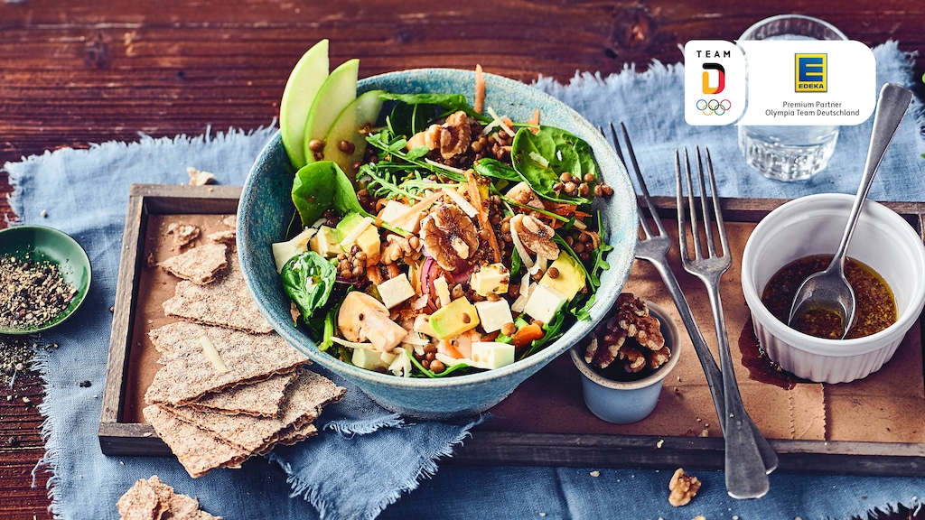 Spinat, Rucola, Avocado, Feta, Champignons, Linsen, Apfel, Karotten, Zwiebeln, Walnüsse und Parmesan auf Tellern anrichten, zickzackförmig mit Dressing übergießen und servieren.