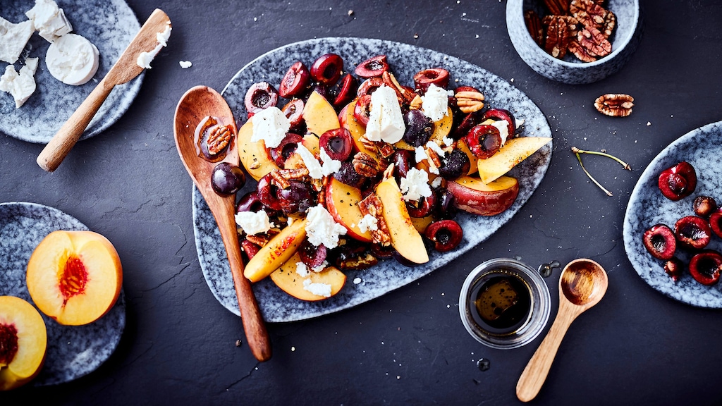 Aus nur 5 Zutaten (+ Salz, Pfeffer, Öl) zaubern Sie hier ruckzuck einen sommerlichen Steinobst-Salat mit Kirschen, Pfirsich, Ziegenkäse, Pekannüssen und Balsamico-Essig.
