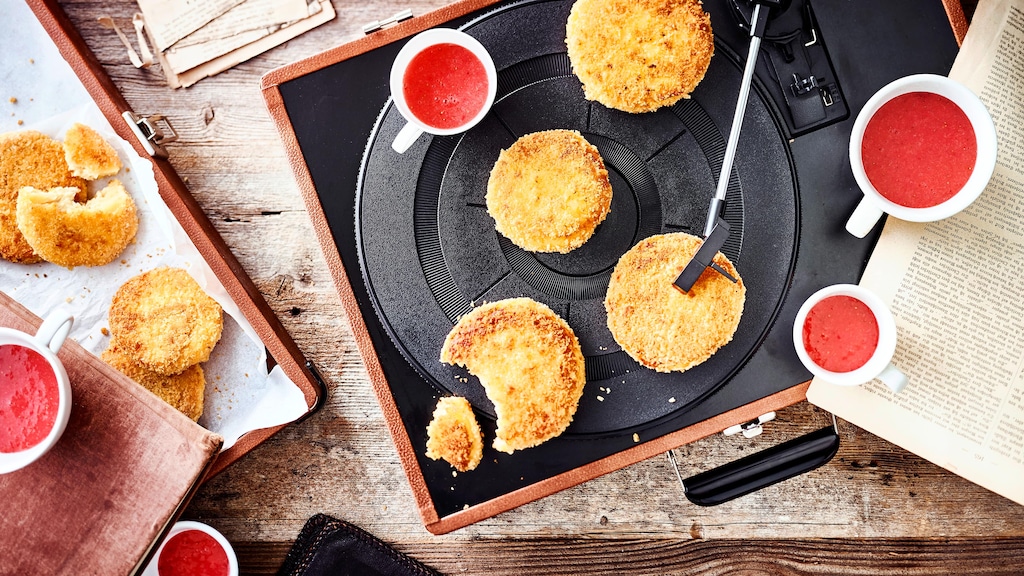 Leckere Plätzchen aus Quarkteig, paniert und gebraten und anschließend mit einer Erdbeer-Orangensaftsoße serviert.