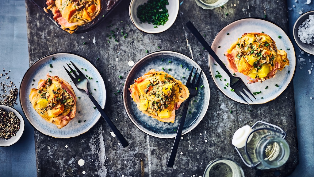 Herzhafte Küchlein aus dem Muffinblech mit Süßkartoffeln und Bacon umwickelt. Schnell gemacht und gleichzeitig raffiniert.
