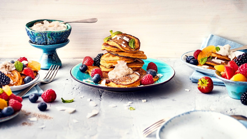 Pfannkuchen einmal anders: Probieren Sie unser Rezept für Süßkartoffel-Pancakes mit Dinkelmehl, frischen Beeren und Kokoschips aus – fruchtig und exotisch!