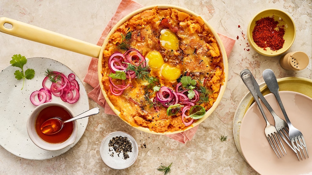 Fusion-Küche ist lange kein Trend mehr. Zu schade wäre es, dieses Süßkartoffel-Shakshuka mit asiatischer Sriratcha-Sauce zu verpassen. Die Spezialität aus Nordafrika eignet sich perfekt für einen deftigen Brunch und ist kinderleicht zubereitet. Wir empfehlen dazu frisches Brot.