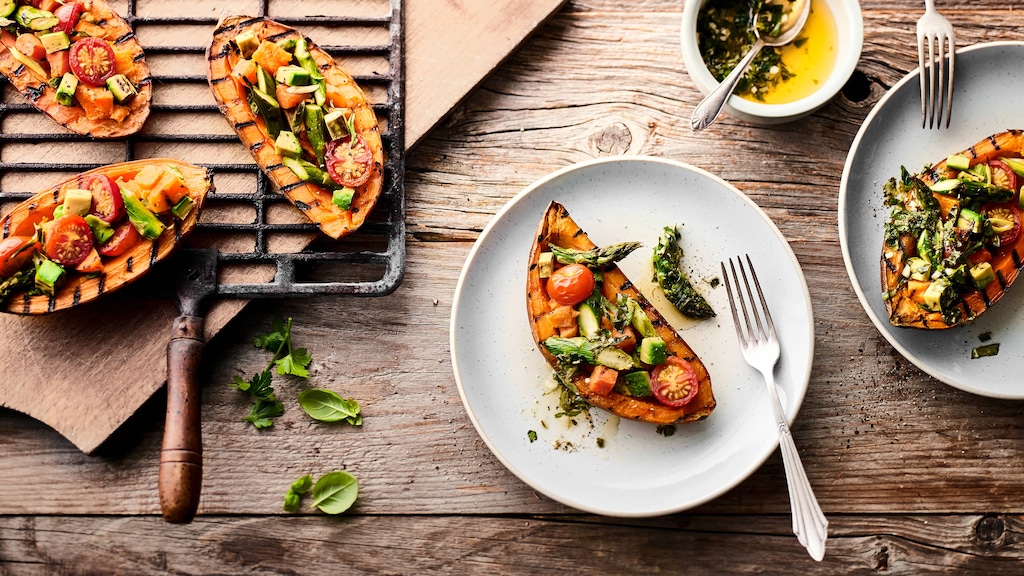Als Beilage in Form von Süßkartoffel-Pommes, püriert oder als geschnippelte Zutat kennt man sie bereits – das Besondere an unserem Rezept: Wir legen die Süßkartoffel im Stück auf den Grill! Genauer gesagt wird die Süßkartoffel im Ganzen vorgekocht, halbiert gegrillt und anschließend mit einem Topping aus Avocado, gegrilltem Spargel und Kirschtomaten belegt. Gekrönt wird das feine Grillgut mit einer spritzig-würzigen Kräuter-Limetten-Soße – himmlisch! Dazu können Sie z. B. einen griechischen Bauern- oder Kritharaki-Salat servieren.