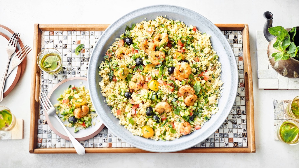 Mit frischem Gemüse und Kräutern und mit einem leichten Dressing aus Olivenöl und Zitronensaft verfeinert – unser Tabbouleh-mit-Garnelen-Rezept