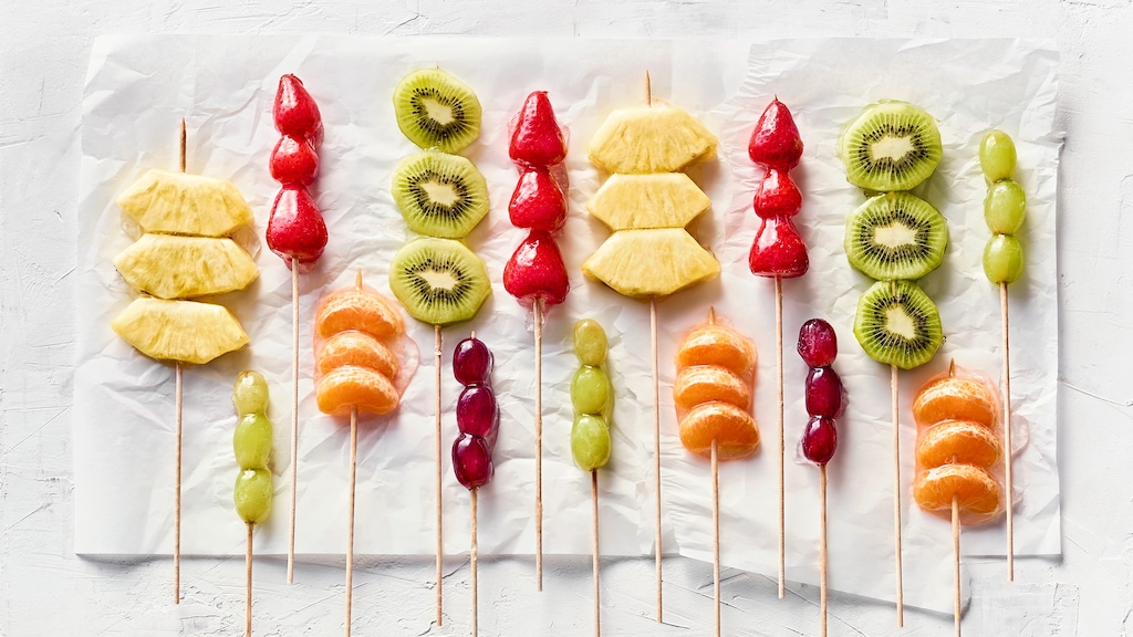 Erdbeeren waschen, ggf. von Grün befreien und auf Küchenpapier abtropfen lassen. Kiwi schälen und in dicke Scheiben schneiden. Mandarine schälen, Weiß entfernen und in einzelne Stücke abtrennen. Trauben waschen und auf Küchenpapier abtropfen lassen. Ananas schälen und in mundgerechte Würfel schneiden. Obst auf Holzspieße aufspießen.