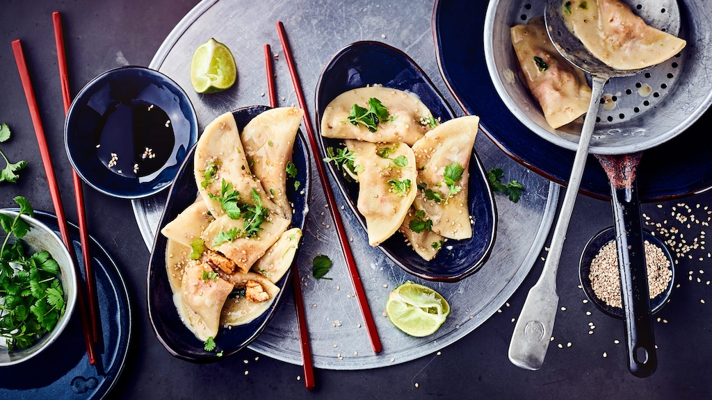 Eine zweite Teigbahn ausrollen, oben auflegen und mit dem Ravioliausstecher ausstechen. Die Ravioli für 5 Minuten in kochendem Wasser garen. Den Koriander abspülen und grob hacken. Die fertigen Thai-Ravioli mit frischem Koriander und etwas Currypulver servieren.