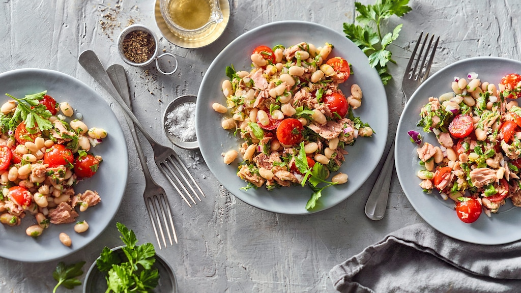 Machen Sie es wie die Italiener und genießen Sie mit unserem Thunfisch-Bohnen-Salat-Rezept die perfekte Kombination aus mediterranen Aromen und frischen, sättigenden Zutaten für warme Tage. Ob als leichte Mahlzeit, Beilage zu Gegrilltem oder Star auf Ihrem nächsten Party-Buffet: Der Salat mit weißen Bohnen und Thunfisch ist in nur 20 Minuten fertig zubereitet. Eine frische Note erhält das Rezept durch die Kirschtomaten sowie Zitrone und Basilikum im Dressing. In Italien werden für den Weiße-Bohnen-Salat mit Thunfisch oft Cannellini-Bohnen verwendet: Sie sind mild im Geschmack, haben eine cremige Textur und stecken voller wertvoller Proteine und Ballaststoffe. Das macht sie zu einer hervorragenden Basis für Salate. Der Thunfisch, idealerweise in Olivenöl eingelegt, fügt dem Gericht eine herzhafte Note und wichtige Omega-3-Fettsäuren hinzu. Mögen Sie den Fisch gern in Kombination mit Pasta, schmeckt Ihnen bestimmt auch unser Nudelsalat mit Thunfisch. Auch als alternativer Belag für Burger macht der Fisch eine gute Figur: Lassen Sie sich von unserem Rezept für Thunfisch-Burger inspirieren.