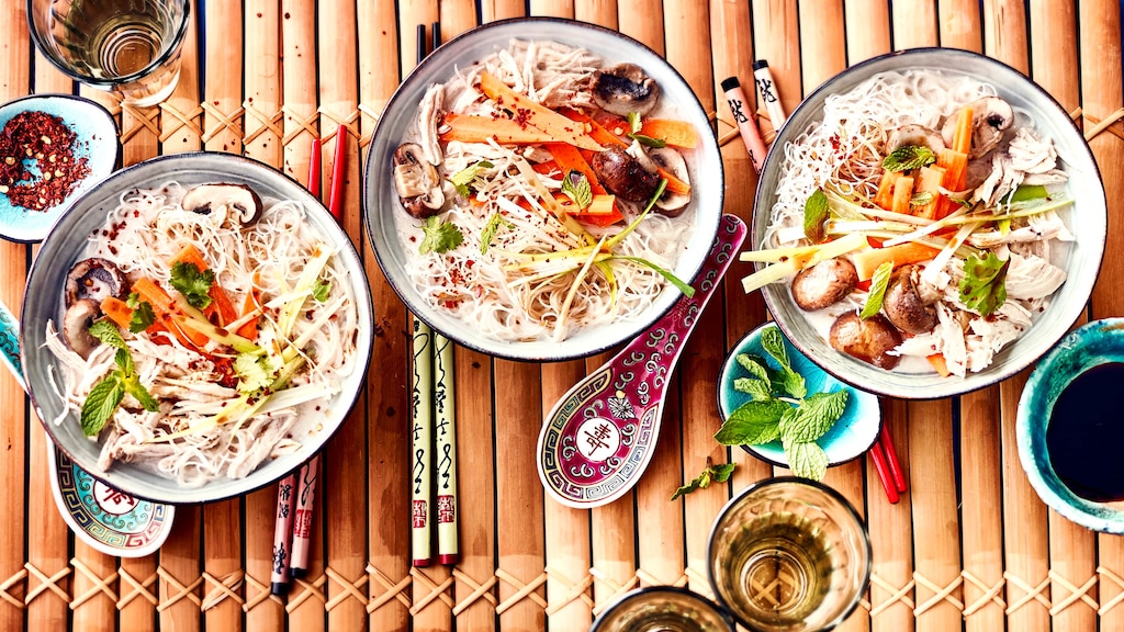 Frischer Koriander, Hühnerbrust, Champignons, Karotten und Ingwer – bereiten Sie schnell und einfach unsere Tom-Ka-Gai-Suppe zu und servieren Sie nach nur 30 Minuten eine pikante (Vor-)Speise mit Reisnudeln und aromatischer Würze.