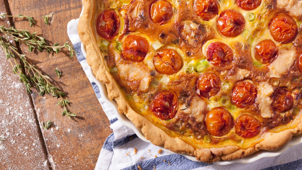 Die Idee stammt aus Lothringen. Dort floss erstmals eine Füllung auf Milch-Eier-Basis über einen in einer Tarte-Form ruhenden Mürbeteig. Essenzielle Zutat der Ur-Quiche, der berühmten Quiche Lorraine, war außerdem Speck – was nicht bedeutet, dass Sie der Grundidee treu bleiben müssen. Für unser Tomaten-Quiche-Rezept verfeinern Sie knusprigen Mürbeteig mit Ziegencamembert, Cocktailtomaten, Frühlingszwiebeln und Thymian. Fleisch fehlt dagegen auf der Zutatenliste. Entsprechend ist unsere Tomaten-Quiche vegetarisch – und unkompliziert. Nur 25 Minuten müssen Sie selbst tätig werden, danach gart sie im Backofen fertig. Gleichzeitig bereiten Sie den Mürbeteig für unsere Tomaten-Zwiebel-Quiche selbst zu. Warum auch nicht? Mit Mehl, Ei, Salz und – ganz wichtig – kalter Butter genügen schließlich vier Zutaten. Bedenken Sie nur, dass Sie Weizenmehl verwenden, weshalb unsere Tomaten-Quiche nicht low carb ist. Für eine Variante ganz ohne Zutaten tierischen Ursprungs probieren Sie unser Rezept für vegane Quiche. Oder Sie versuchen sich alternativ mal an veganer Galette, der pflanzlichen Variante einer weiteren französischen Spezialität.