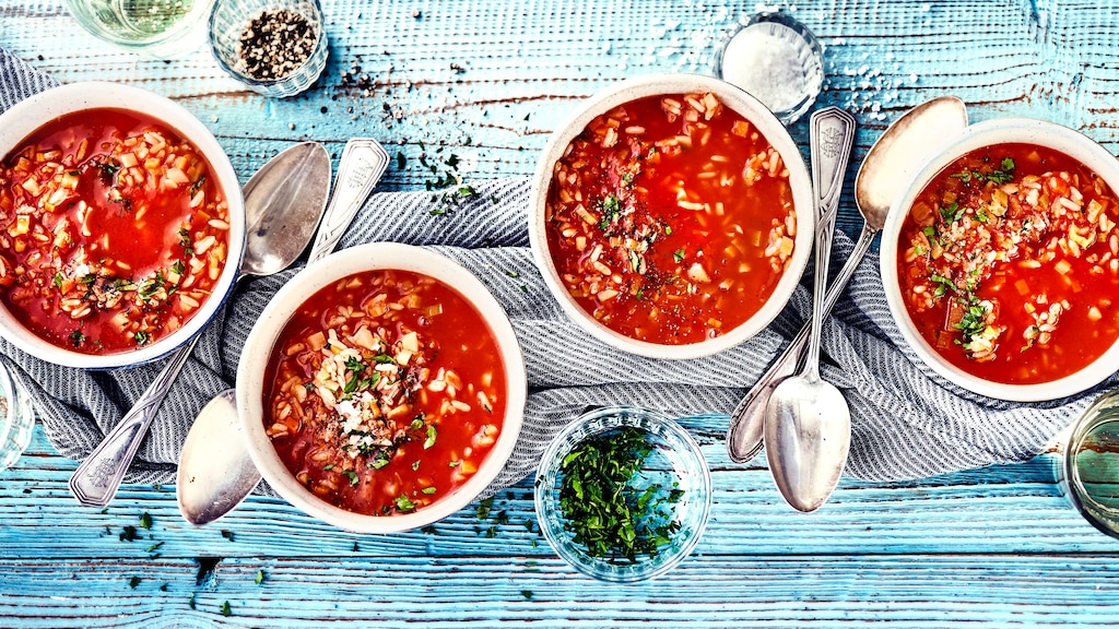 In unserer Reissuppe vereinen sich Tomaten, Petersilienwurzeln, Lauch, Möhren und Sellerie mit Reis und Kräutern zu einem köstlichen Gericht, das auch Vegetariern und Veganern schmeckt. Die Tomaten werden püriert und durch ein Sieb passiert, während das restliche Gemüse in Würfel geschnitten wird. Für eine zeitsparende Variante können Sie passierte Tomaten aus der Dose verwenden. Ansonsten lohnt es sich frische Tomaten zu verarbeiten: Sie schmecken in der Regel aromatischer. Ebenso sei Ihnen zu einem hochwertigen Olivenöl geraten, in dem die Gemüsewürfel und das Tomatenmark zunächst anschwitzen, bevor der Gemüsefond hinzukommt. Der Reis wird separat gekocht und erst zum Schluss in die Suppe gegeben. Die Kräuter streuen Sie darüber, wenn die Suppe bereits auf Tellern angerichtet ist. Für eine Tomatensuppe mit Paprika und Croûtons empfiehlt sich unser Tomatensuppe-Rezept. Verzichten Sie wiederum komplett auf tierische Produkte, kochen Sie am besten unsere vegane Tomatensuppe nach.