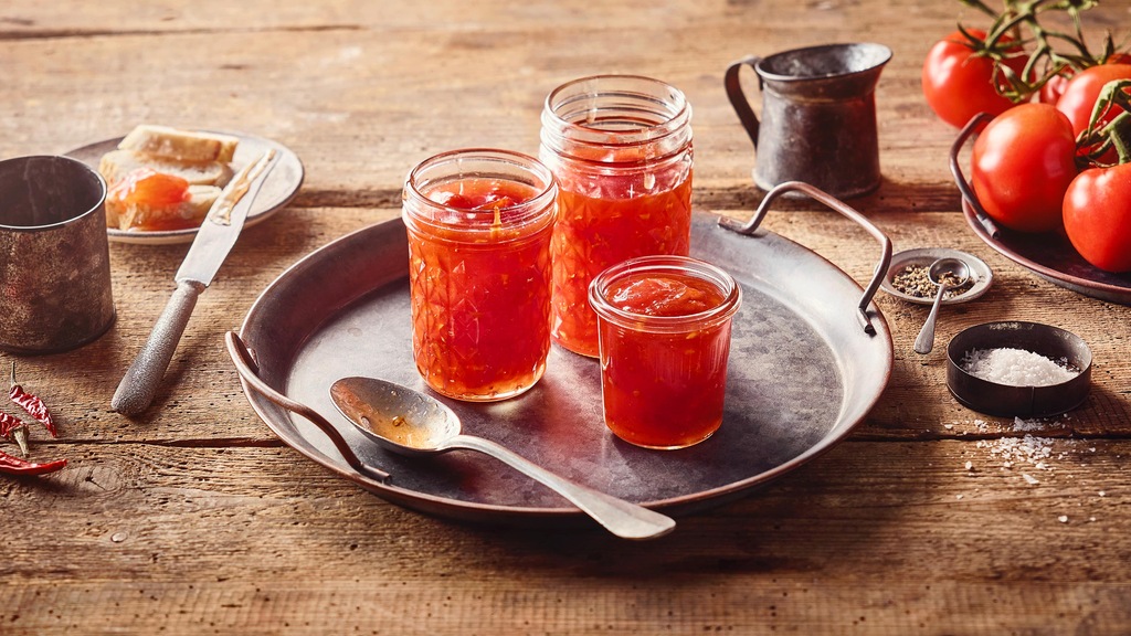Unsere schnelle Tomatenmarmelade lässt sich wie jede Konfitüre aufs Brot oder Brötchen streichen, ist aber auch zu Grillfleisch, Käse und als Topping für Burger oder Salate ein echter Volltreffer. Eng verwandt ist die raffinierte Tomatenmarmelade mit dem Tomaten-Chutney, das wir mit Ingwer, Chili und Honig würzen.