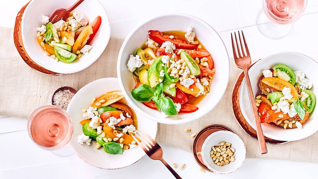 Das Rezept für Tomatensalat mit Feta ist Ihnen doch ein bisschen zu experimentell? Dann probieren Sie unser klassisches Rezept für griechischen Salat mit Feta. Dieses rein vegetarische Rezept, das übrigens hervorragend zu Kritharaki passt, lässt sich je nach Gusto auch wunderbar mit in Olivenöl gebratenen oder gegrillten Garnelen ergänzen. Tomatensalat gibt es aber natürlich auch in viel mehr Variationen als der klassisch-griechischen: Stöbern Sie doch einmal in unserer Sammlung von Tomatensalat-Rezepten nach einer neuen Lieblingsvariante! Besonders im Sommer ist die italienische Spezialität „Caprese“ – eine Kombination aus Tomate, Mozzarella und Basilikum – beliebt. Und auch mit unserem Tomatensalat-Rezept, bei dem Erdbeeren und Feigen auf der Zutatenliste stehen, kreieren Sie einen außergewöhnlichen sommerlichen Genuss.