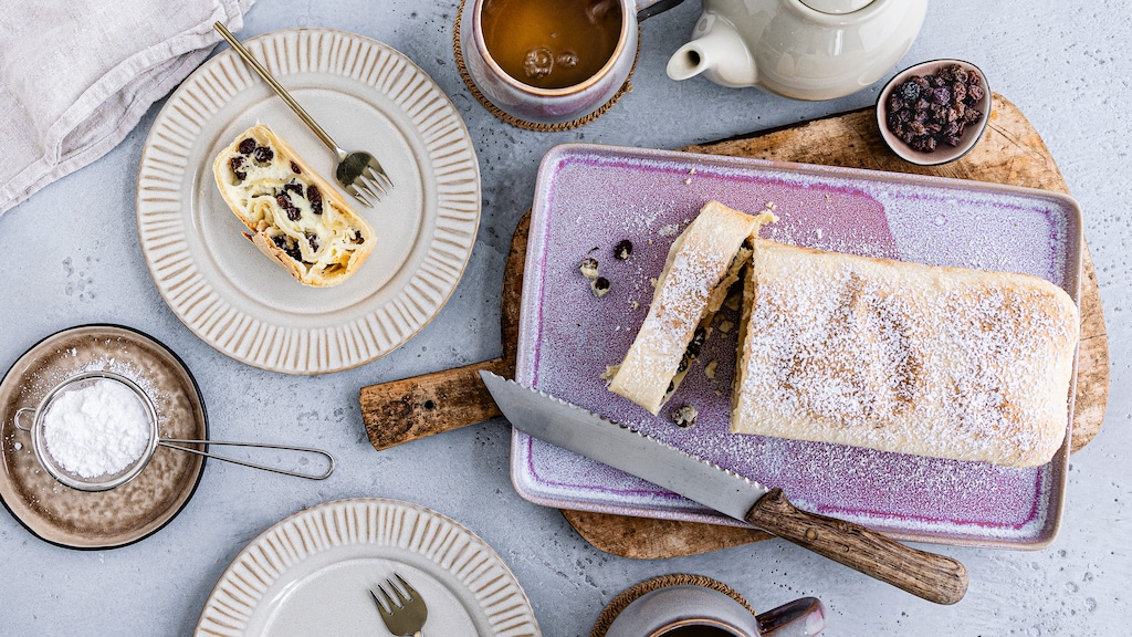 Tatsächlich ja: Topfen ist etwas fettarmer und trockener. Bei den meisten Backwaren spielt das keine Rolle und die Produkte lassen sich problemlos untereinander austauschen. So auch bei unserem Topfenstrudel. In Österreich würde man für Topfenstrudel wie auf der Alm zur Variante mit 20 % Fett greifen, aber ein Quark mit 40 % tut es auch. Lassen Sie das Milchprodukt für die „deutsche“ Variante vor der Weiterverarbeitung einfach etwas abtropfen, um überschüssige Flüssigkeit zu entfernen. Das empfiehlt sich für alle Strudelteig-Rezepte: Der zarte Teig weicht sonst schnell durch.